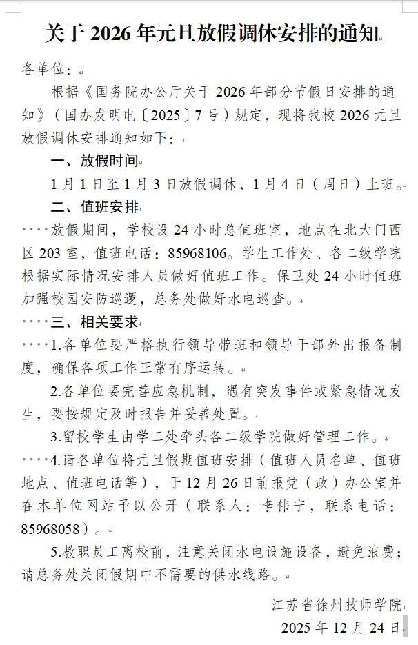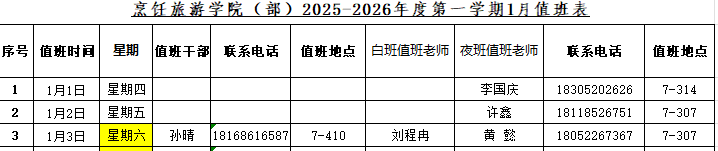 烹饪旅游学院2026年元旦放假调休安排及值班通知