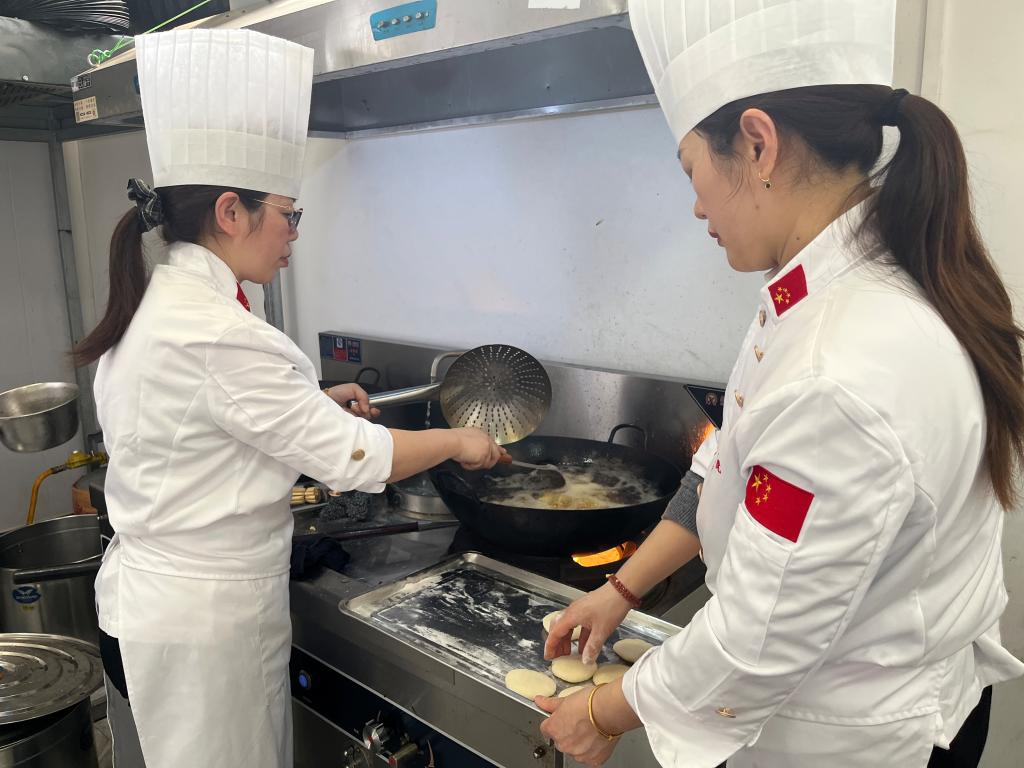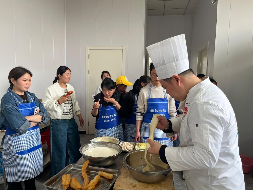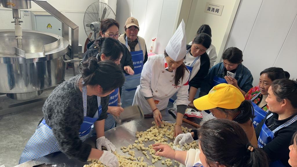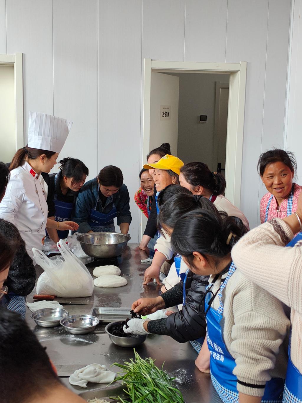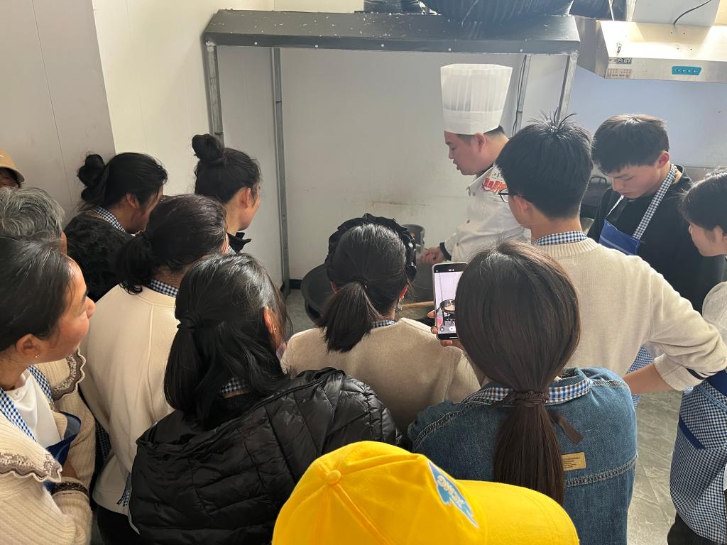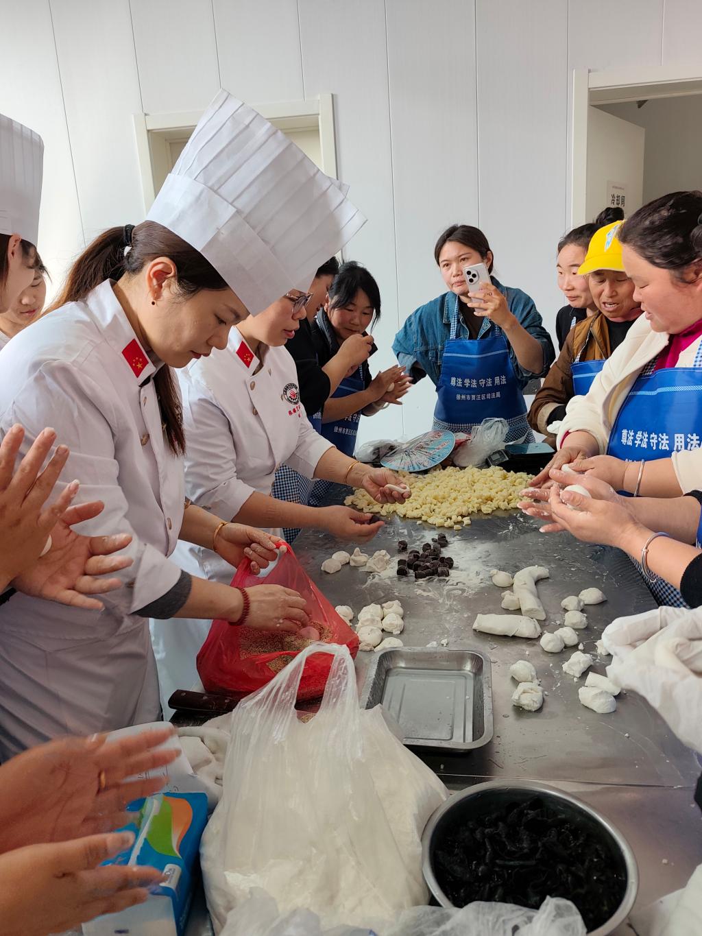 在“技能帮扶到户”环节,面点专业教师现场演示了炸油条的全过程,从和面、醒发到油温控制,逐一讲解关键技巧,手把手指导村民操作。村民们踊跃上手实践,切身感受到掌握“一技之长”带来的获得感与成就感。此外,教师们还教授了几款简单易学的家常糕点,利用当地食材制作创意点心,并邀请村民共同品鉴交流。活动现场气氛热烈,村民们纷纷表示:“这样的帮扶太实用了,在家门口就能学到真本事!”