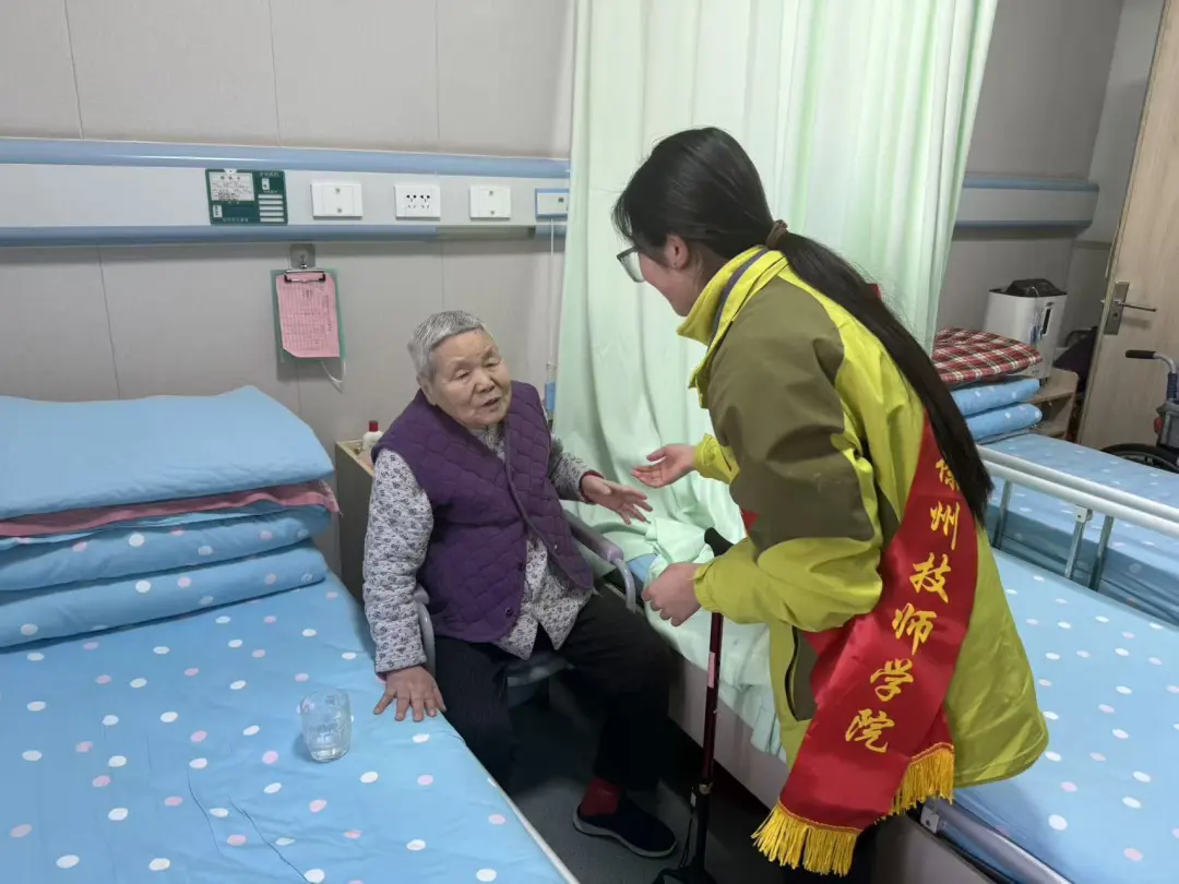 午餐过后,温暖的阳光洒满院落。同学们三两成群,或俯身倾听着爷爷奶奶讲述往事,或小心翼翼地推着轮椅,陪他们在院子里散步、晒太阳。年轻的身影与慈祥的面容相映成趣,欢声笑语回荡在康养中心的每个角落。这一刻,专业的技能已内化为自然的行动,真诚的陪伴成为了最好的关怀。