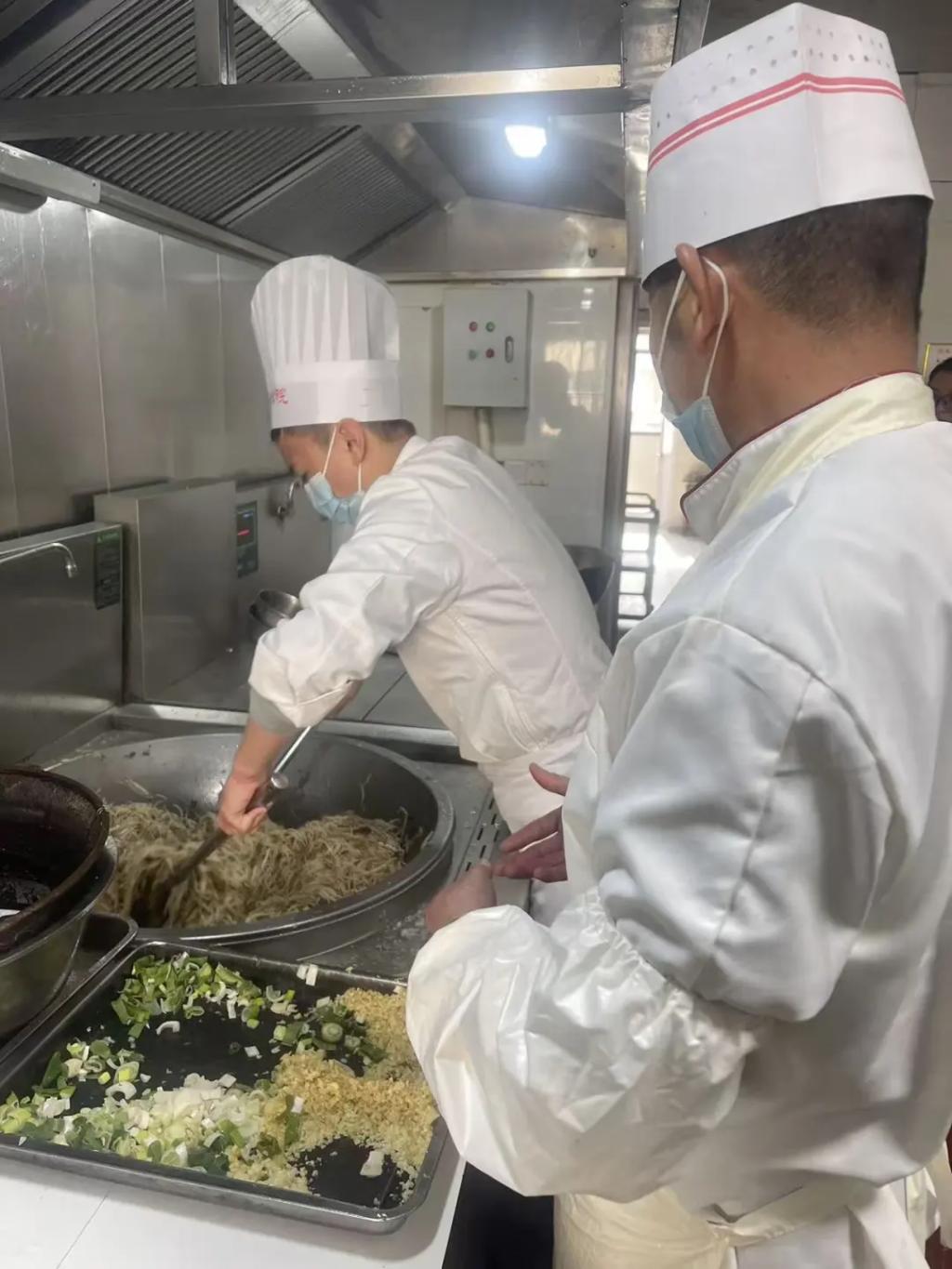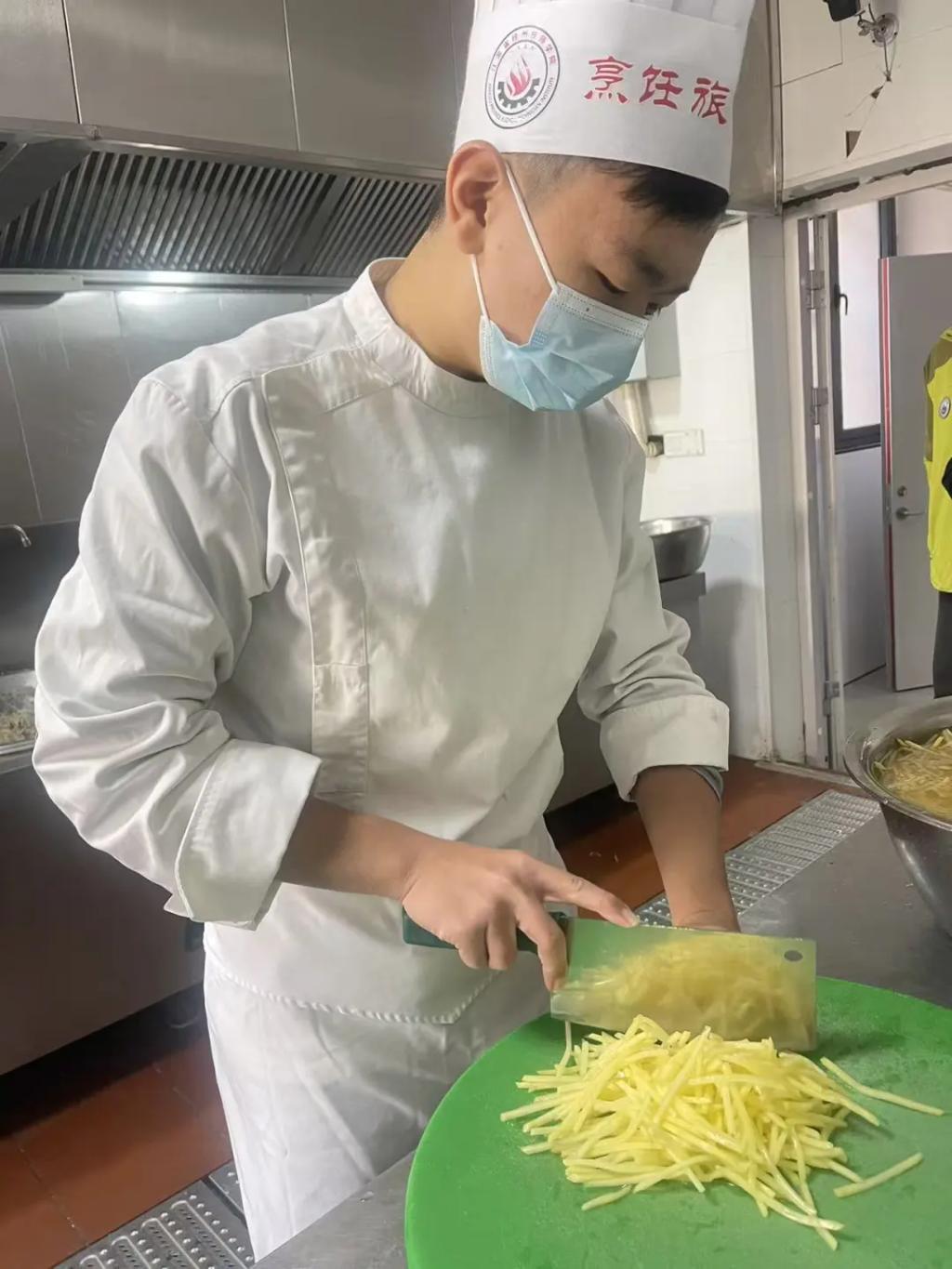 同学们系上围裙,立刻投入到紧张而有序的备餐工作中。洗、切、配、炒,每一个环节都井然有序,一丝不苟。他们充分发挥在校所学的烹饪技艺,用心为老人们准备营养可口、软硬适宜的午餐。灶台上升腾的炊烟,与同学们额角的汗水交织在一起,化作冬日里最温暖的人间烟火。这份用专业与心意烹制的菜肴,承载的是学子们对长者最质朴而真诚的关怀。